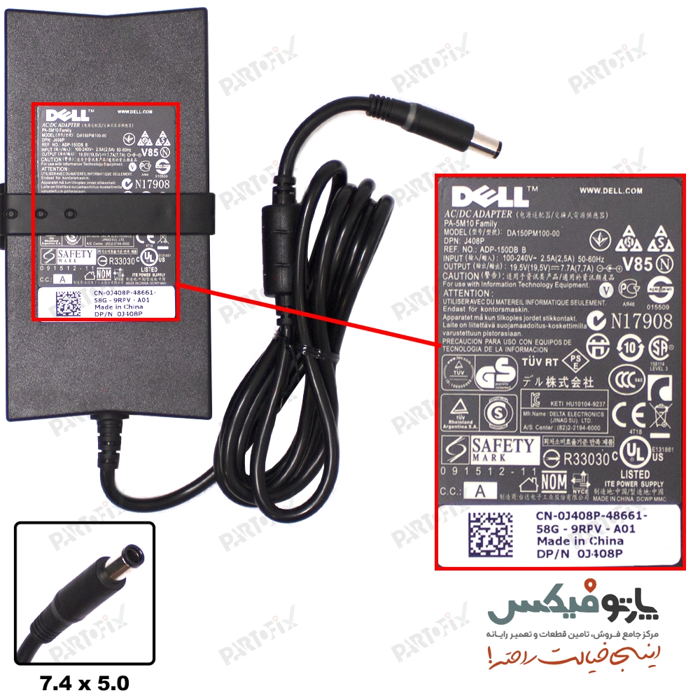 مشخصات شارژر اورجینال لپ تاپ دل 19.5 ولت 7.7 آمپر اسلیم کانکتور 5.0* 7.4