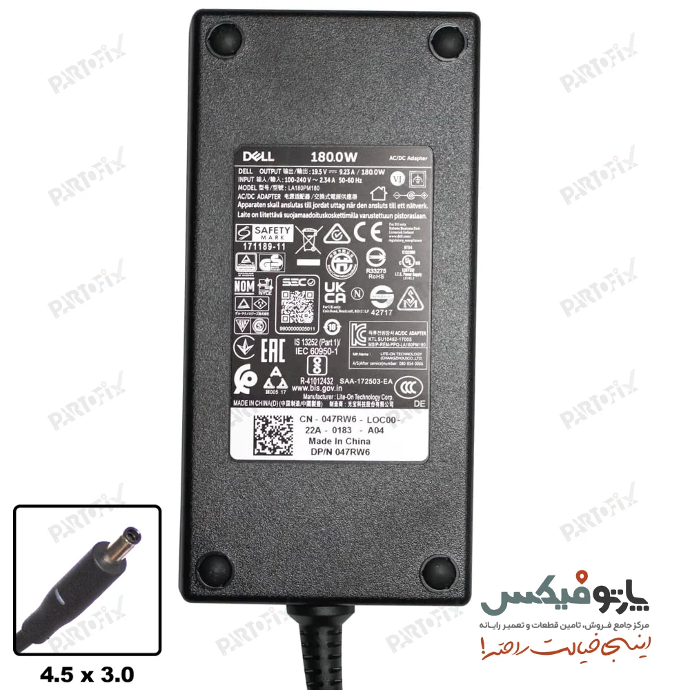 مشخصات شارژر اورجینال لپ تاپ دل 19.5 ولت 9.23 آمپر کانکتور 4.5x3.0 اسلیم
